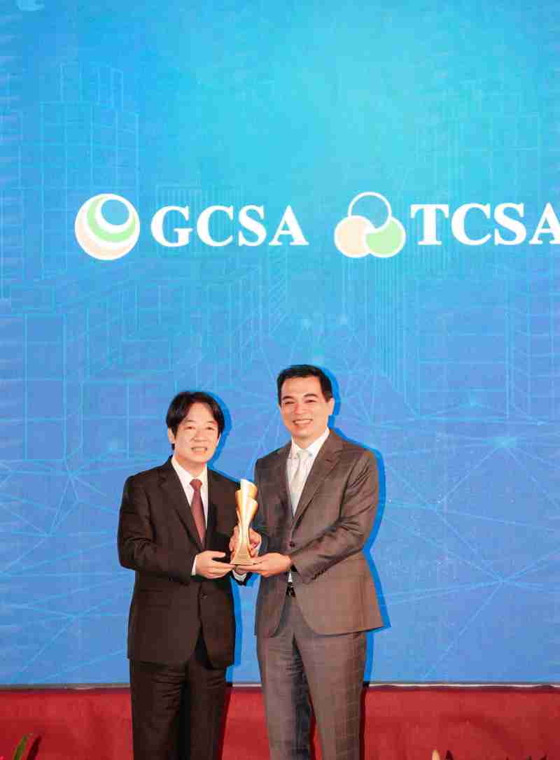 达全方位永续表现获全球永续奖及台湾永续奖肯定,,,,由副总统赖清德颁奖 (左),,,,巨星国际总经理柯富仁 (右) 代表领奖