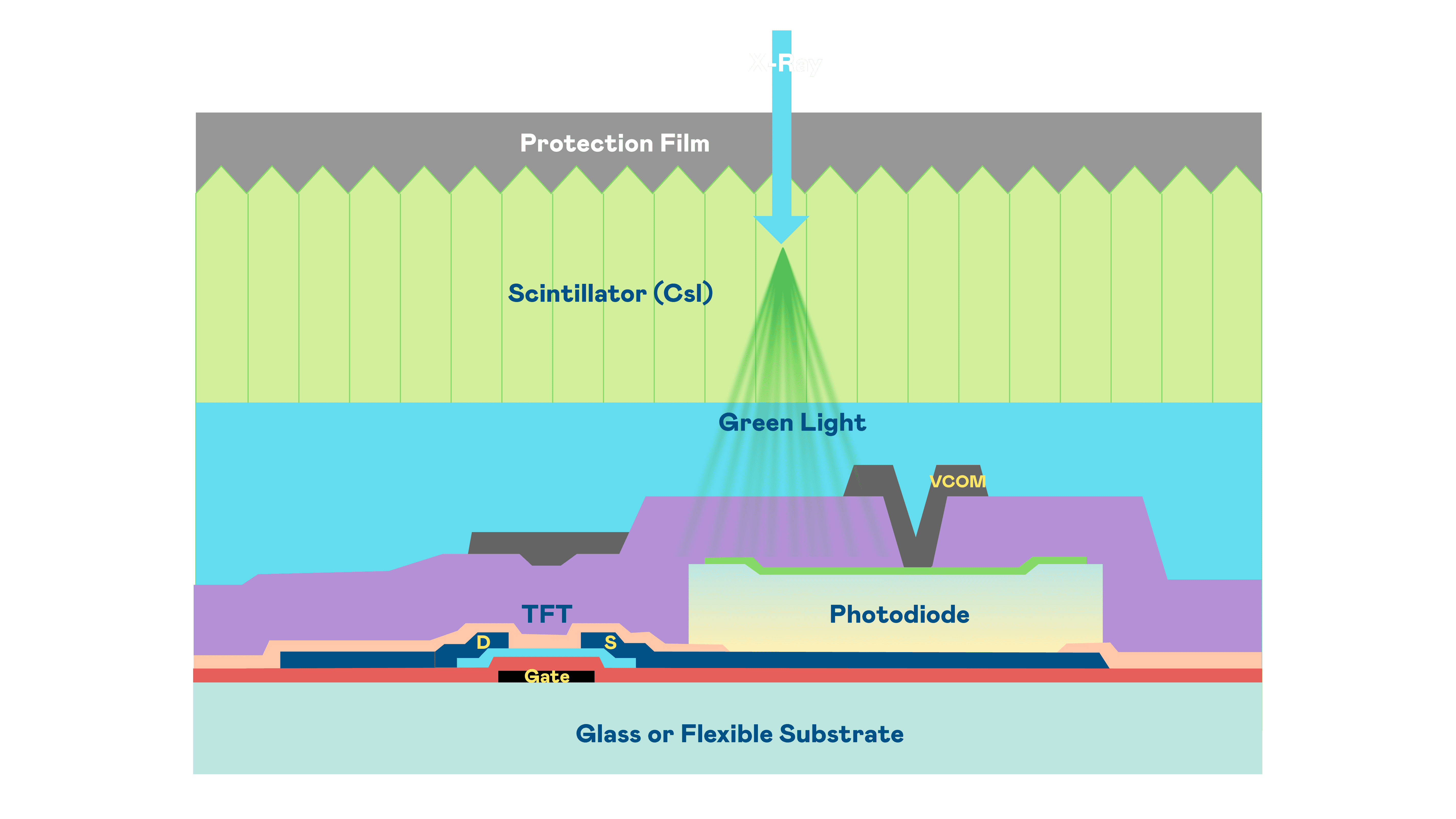 巨星国际的X光影像感测阵列使用薄膜电晶体 (TFT) 作为每个像素的读取开关,,,,搭配光电二极体(Photodiode)的光电转换元件,,,,用以感测X光影像讯号。。。。